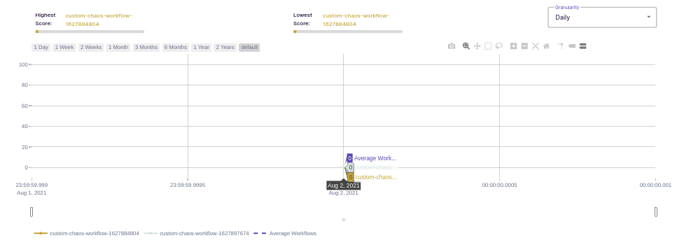 In first tab, you can compare number of chaos scenario runs according to selected granuality i.e. Daily/Monthly/Hourly. Granuality can be changed using drop-down in top right corner.